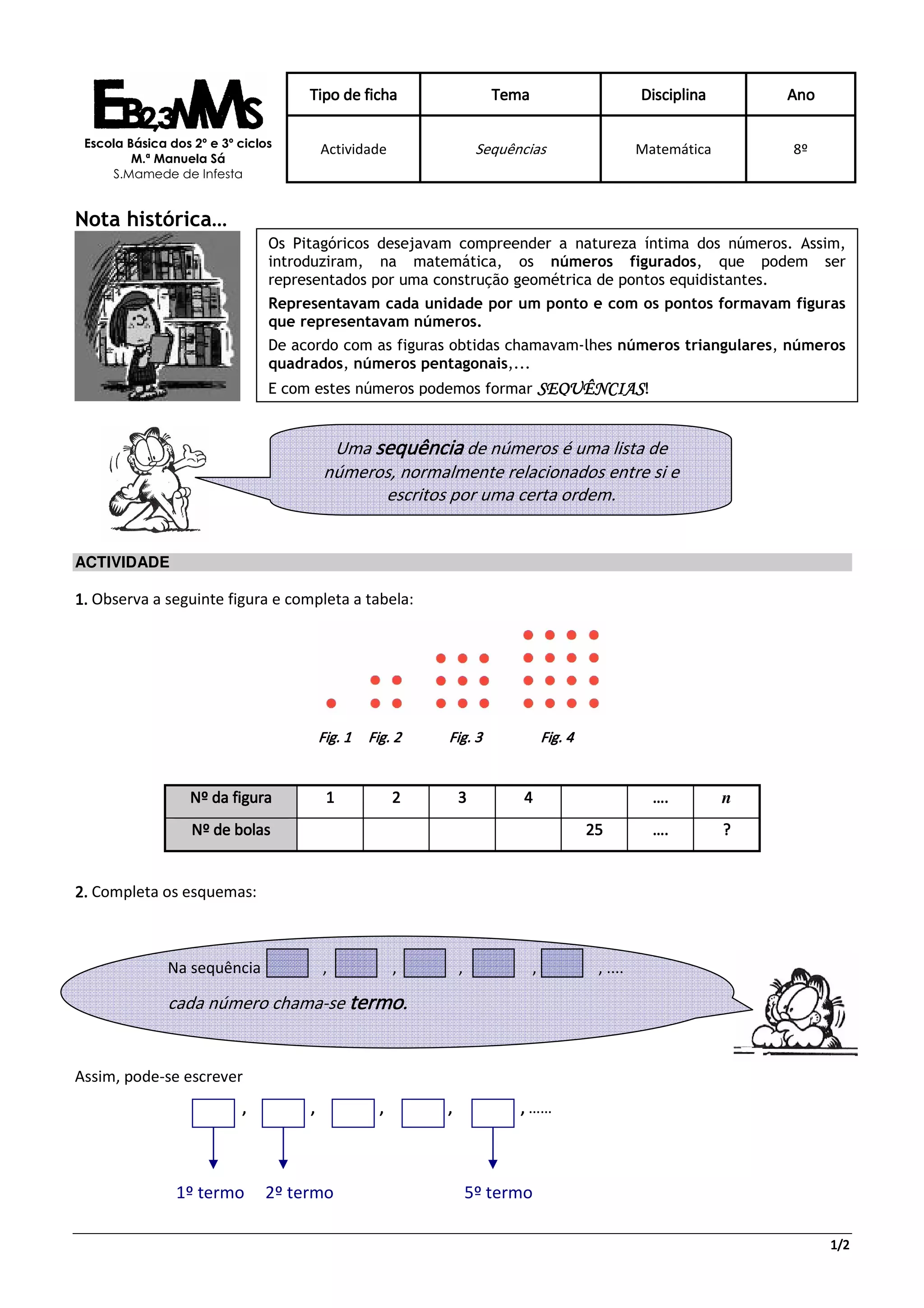 Este documento apresenta uma atividade sobre sequências numéricas para alunos do 8o ano. Introduz conceitos como números figurados, sequências e termos gerais. A atividade pede aos alunos que completem tabelas, esquemas e afirmações sobre uma sequência cujo termo geral é n2, e analisem outra sequência dada por 2n + 1.