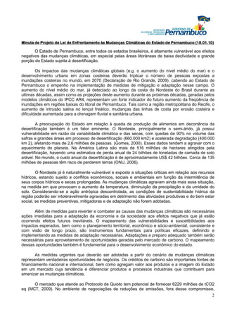 Este documento propõe uma lei climática para o estado de Pernambuco para enfrentar as mudanças climáticas. Ele destaca a vulnerabilidade de Pernambuco aos impactos das mudanças climáticas, como aumento do nível do mar e desertificação, e a oportunidade de desenvolvimento de energias renováveis e mercado de carbono. A lei estruturaria um plano climático e medidas de mitigação e adaptação para Pernambuco.
