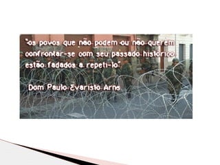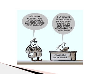 O documento descreve o período da ditadura militar no Brasil entre 1964-1985, quando o governo de João Goulart foi deposto por um golpe militar. O texto detalha as reformas propostas por Goulart que beneficiavam os trabalhadores, a repressão e tortura realizadas pela ditadura, e a luta do povo brasileiro por liberdade e democracia.