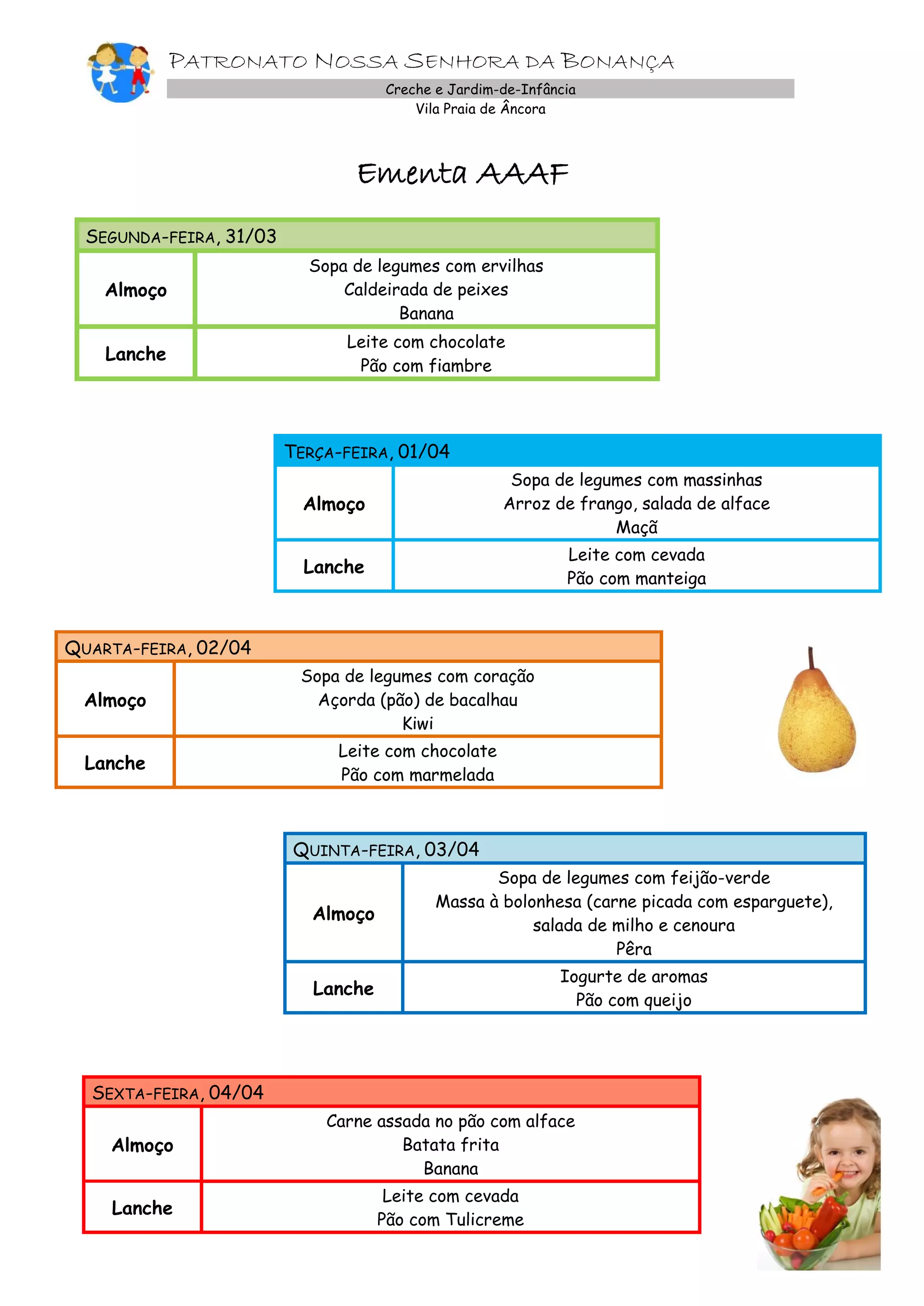Este documento apresenta as ementas semanais da creche e jardim-de-infância Patronato Nossa Senhora da Bonança em Vila Praia de Âncora, incluindo os pratos servidos no almoço e lanche de cada dia, entre 31 de março e 2 de maio.