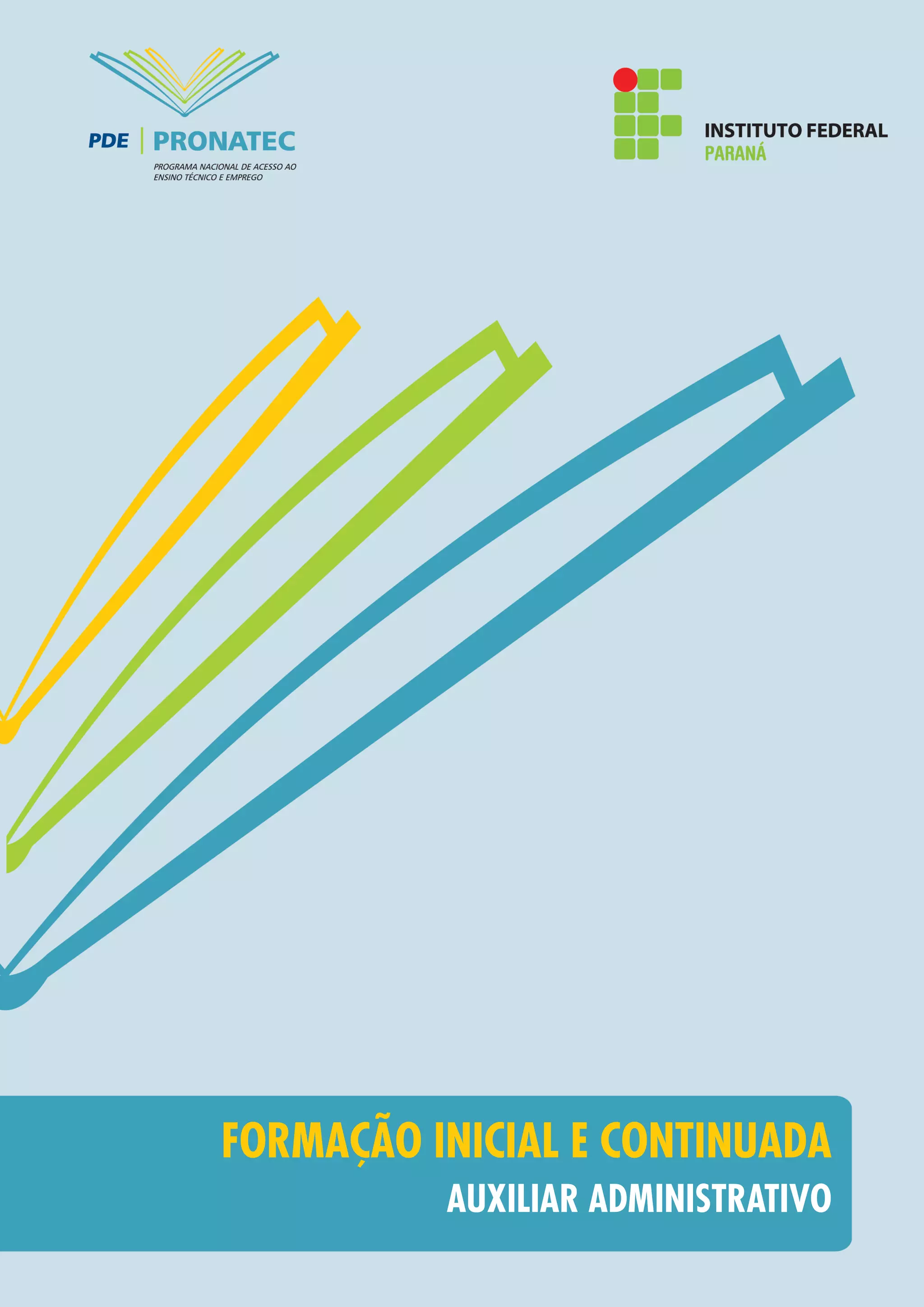 Este documento fornece informações sobre o curso de Auxiliar Administrativo, abordando seus fundamentos, noções de gestão empresarial e o papel deste profissional no ambiente organizacional. O documento apresenta o IFPR e seus dirigentes, além de três unidades temáticas sobre administração, gestão e atuação do auxiliar administrativo.