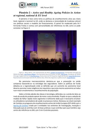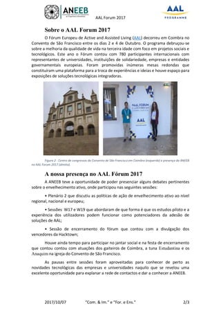 O documento resume o AAL Forum 2017 que ocorreu em Coimbra, Portugal, com foco em projetos de tecnologia e sociedade para melhorar a qualidade de vida dos idosos. O evento contou com 780 participantes internacionais de universidades, organizações e governos. Várias mesas redondas e exposições trouxeram ideias e soluções tecnológicas. A ANEEB participou de debates sobre envelhecimento ativo e políticas de ação ao nível regional, nacional e europeu.