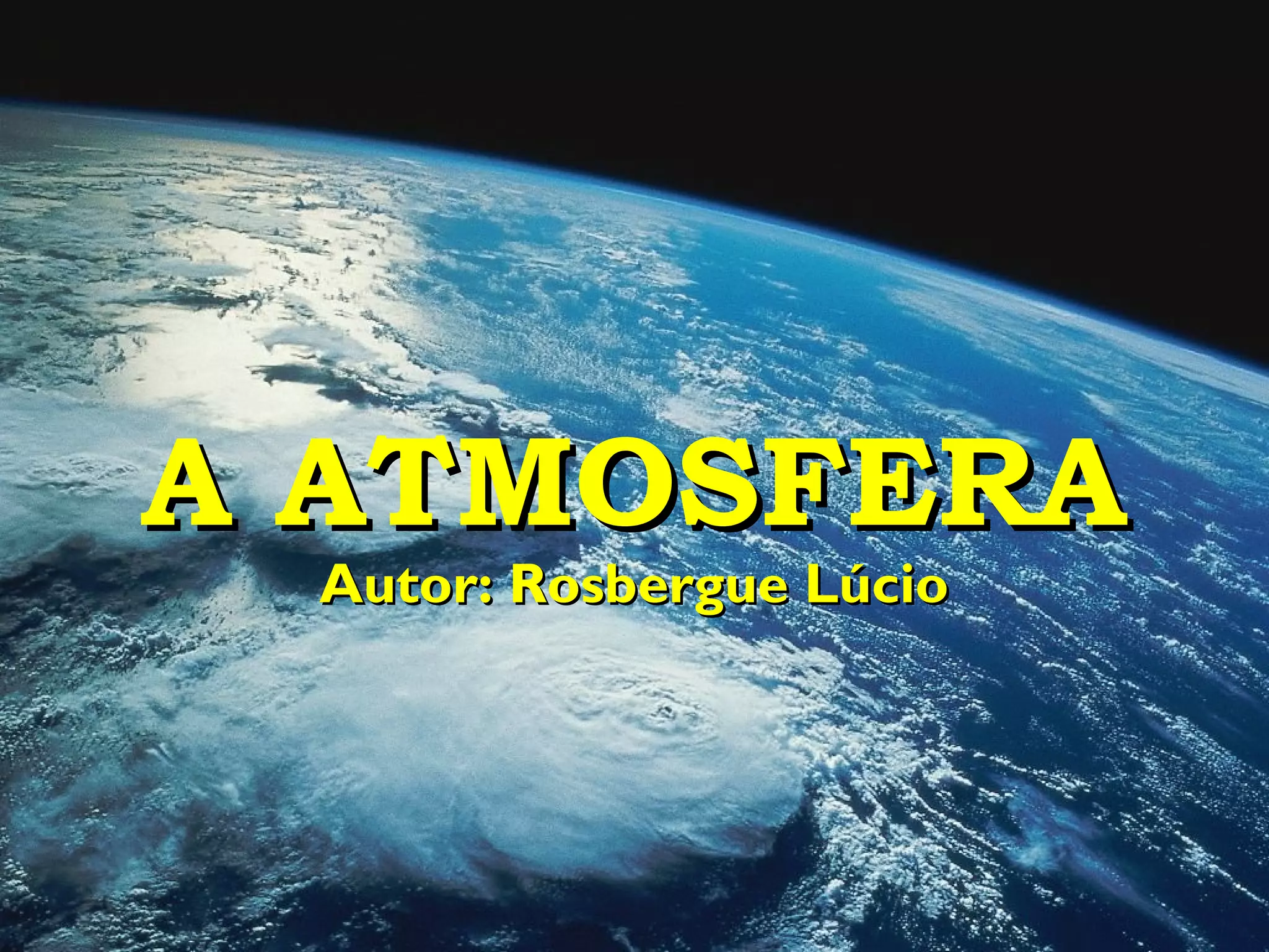 O documento descreve as propriedades e componentes da atmosfera terrestre. A atmosfera é formada principalmente por nitrogênio, oxigênio e gás carbônico, e divide-se em diferentes camadas. O documento também discute o ciclo do oxigênio, do carbono e do nitrogênio, assim como o efeito estufa e o aquecimento global.