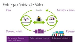 O documento discute práticas ágeis de desenvolvimento de aplicações, incluindo padrões de implantação em produção como canary, A/B testing e blue-green. Também aborda o papel da equipe de QA, métricas de serviço, crescimento de contas, conversão de usuários e a importância de monitoramento e métricas para melhoria contínua.