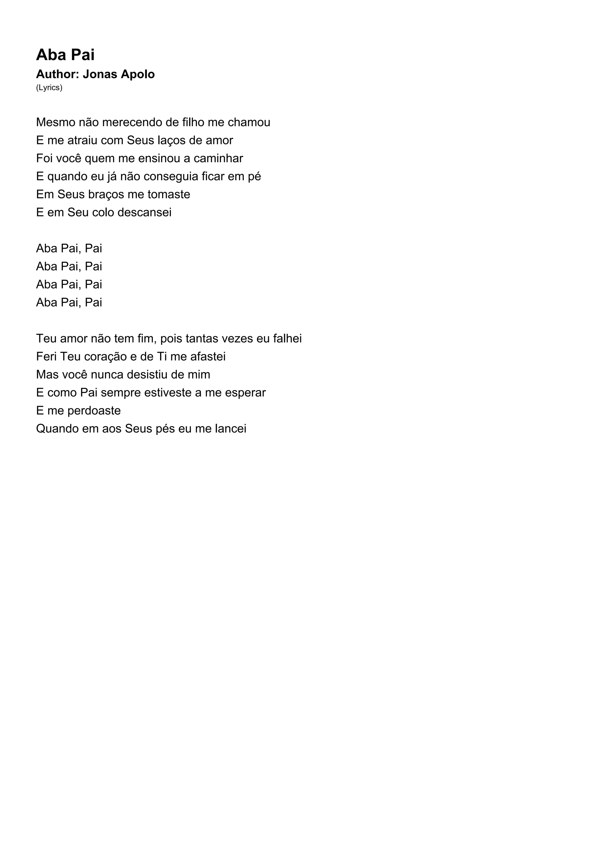 O documento é uma música chamada "Aba Pai" que celebra o amor incondicional de Deus como um pai. A música descreve como Deus chamou o autor mesmo que ele não merecesse, o ensinou a caminhar e o confortou quando ele não conseguia ficar em pé. Apesar de muitas falhas e afastamentos, Deus nunca desistiu do autor e sempre o perdoou.