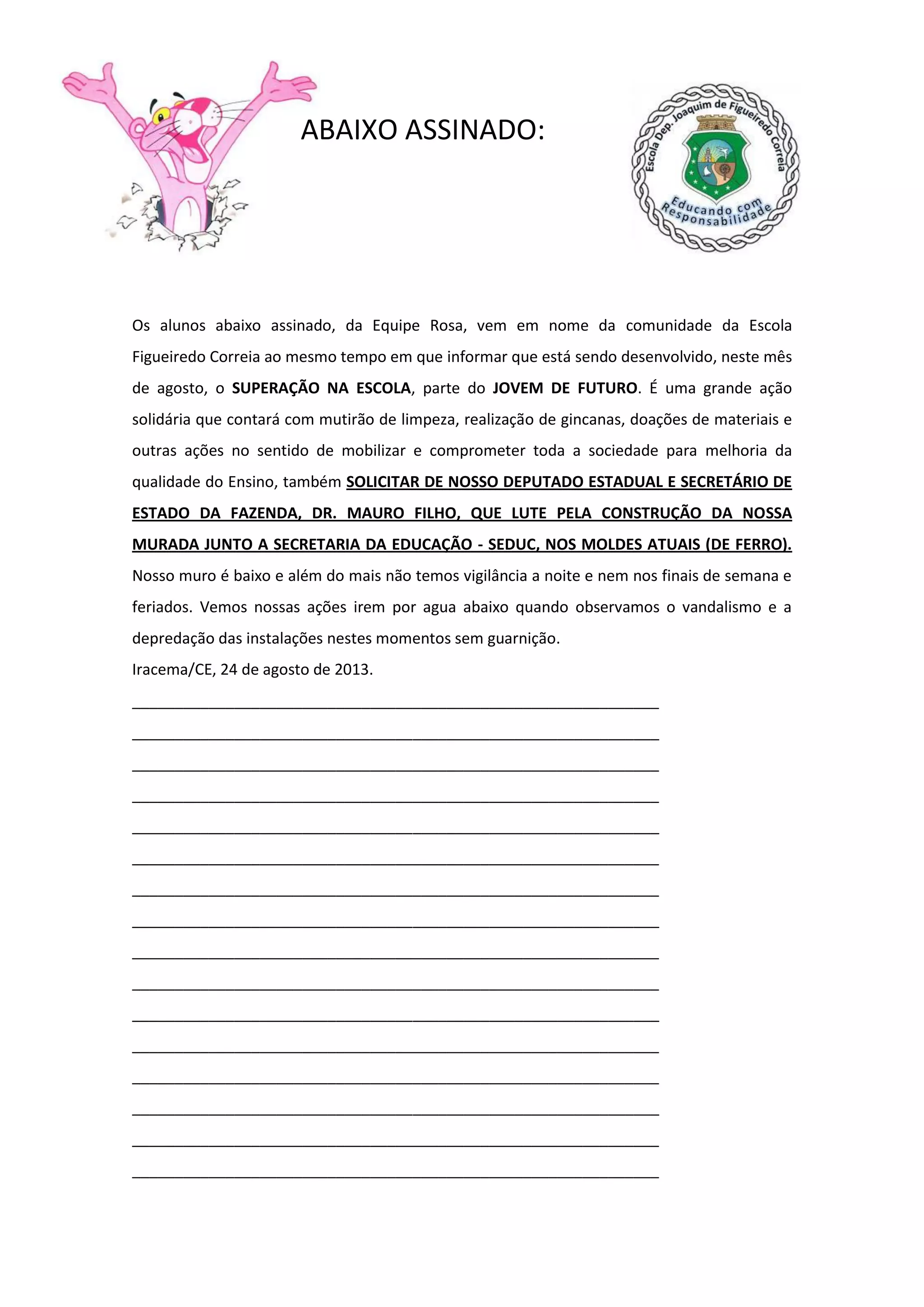 Os alunos da Equipe Rosa solicitam ao deputado estadual e secretário de fazenda que lutem pela construção de um muro na Escola Figueiredo Correia, já que o muro atual é baixo e a escola não tem vigilância nos finais de semana. Eles também solicitam à vereadora Edna Tomaz que lute junto à prefeitura para limpeza da antiga área da horta comunitária da escola, repleta de mato.
