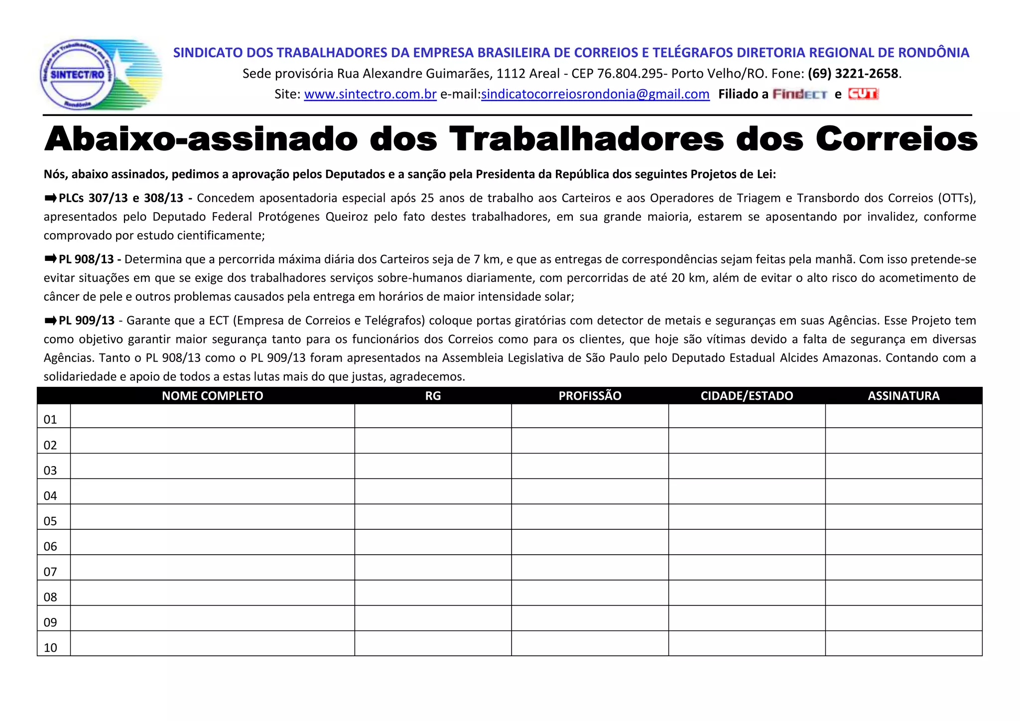 O sindicato dos trabalhadores dos Correios pede a aprovação de projetos de lei que concedem aposentadoria especial após 25 anos de trabalho para carteiros e operadores de triagem e transbordo e determinam limites para a percorrida diária e horário de entrega de carteiros, além de exigir segurança em agências dos Correios. O documento lista 151 assinaturas em apoio.