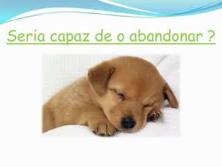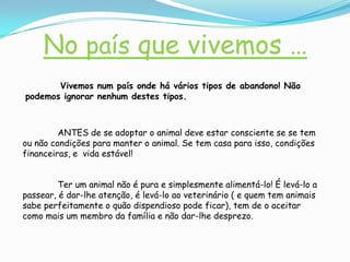 O documento discute os motivos para o abandono de animais, incluindo férias, gravidez, caça e vaidade. Também cobre a Declaração Universal dos Direitos dos Animais e enfatiza a importância de adotar animais abandonados, desde que se tenha tempo e recursos para cuidar deles.