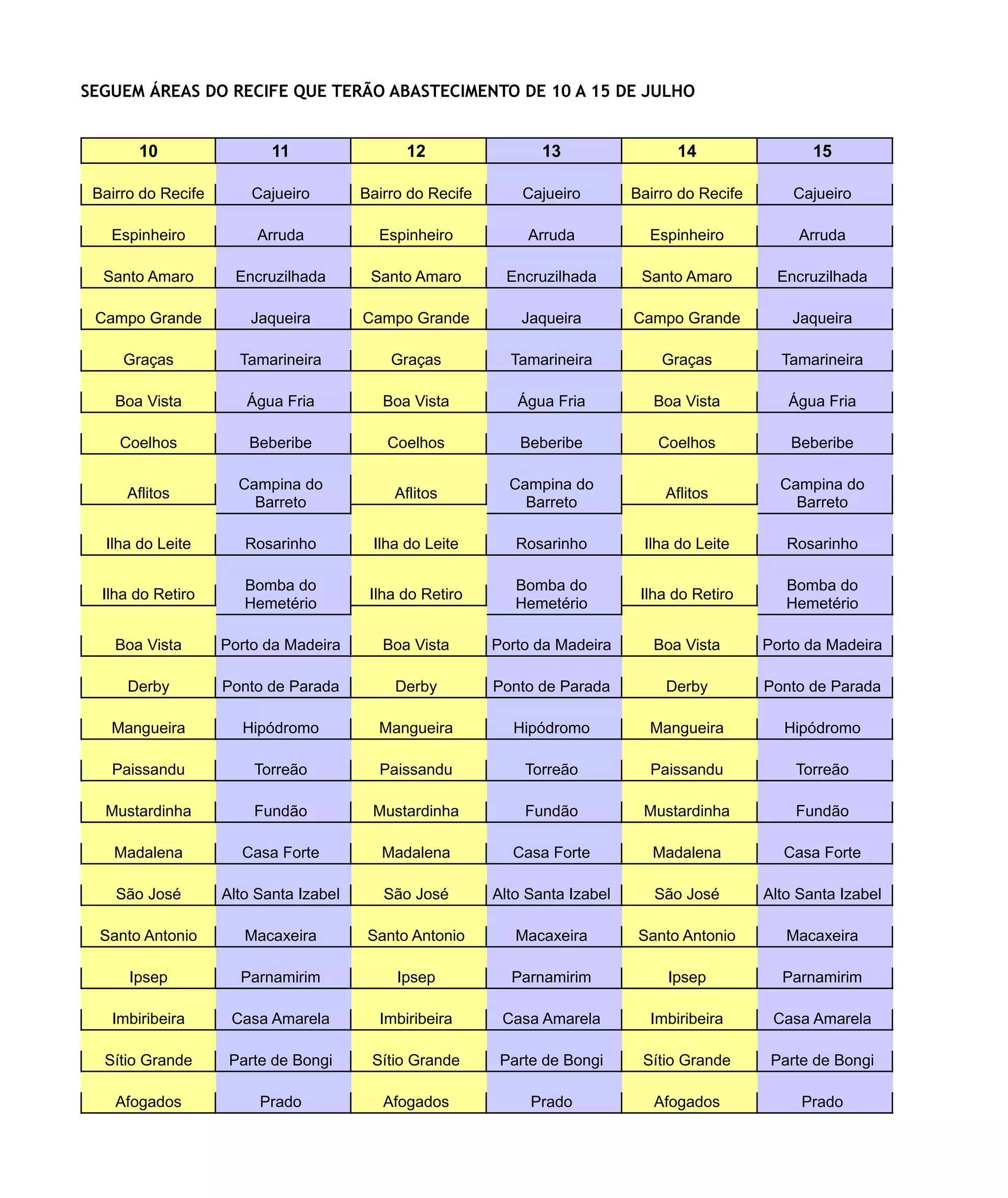 SEGUEM ÁREAS DORECIFE QUE TERÃO ABASTECIMENTO DE 10 A 15 DE JULHO