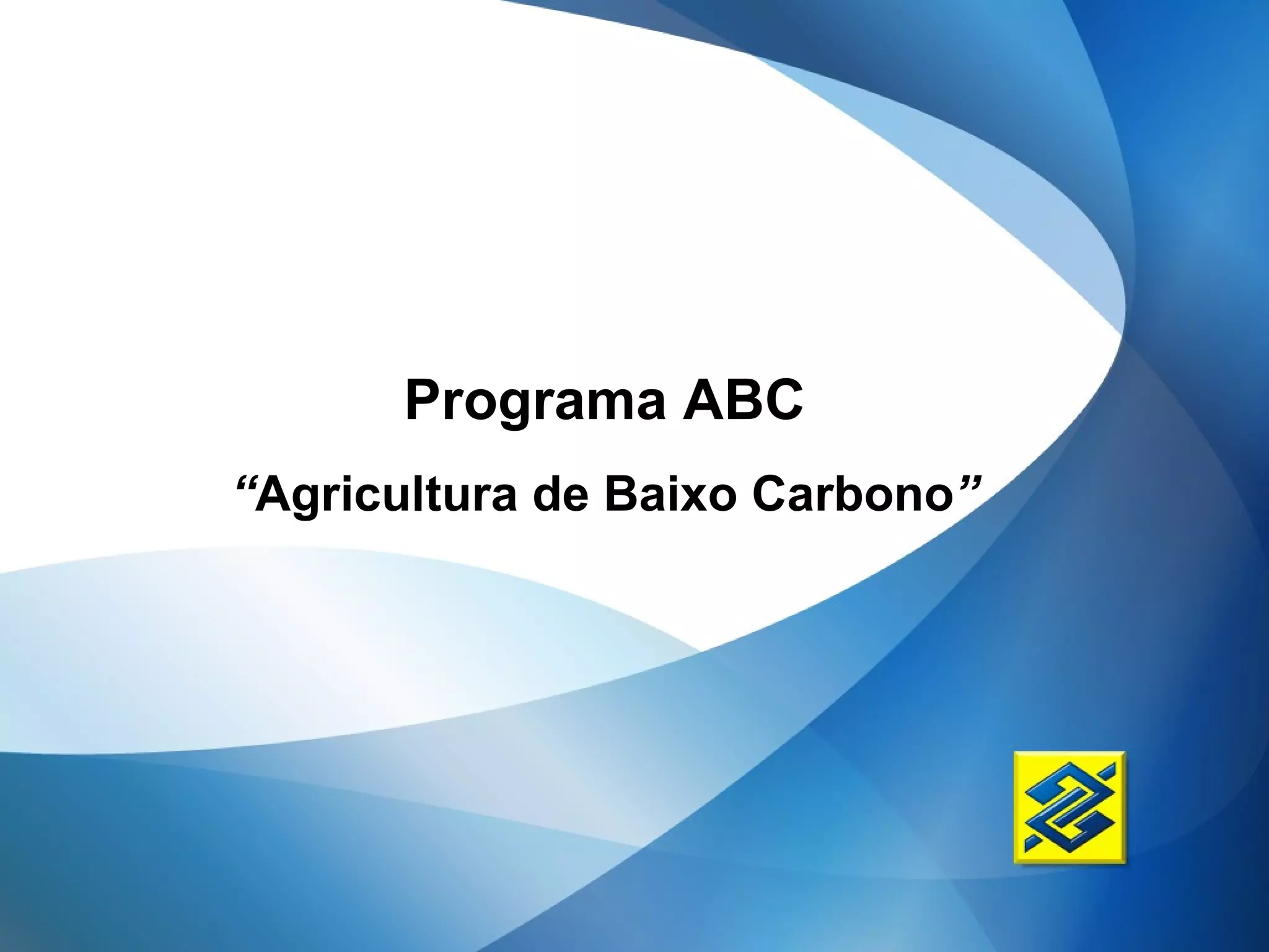 O Programa ABC é uma linha de crédito do Banco do Brasil para investimentos em sistemas agroflorestais sustentáveis com objetivos de reduzir emissões de gases de efeito estufa, desmatamento e ampliar produção sustentável. O financiamento cobre até R$1 milhão por projeto com taxas de 5,5% a.a. fixas e prazos de até 180 meses, dependendo do tipo de projeto. O Banco do Brasil já liberou quase R$1 bilhão nessa linha de crédito.