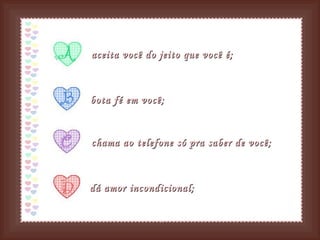 aceita você dojeito que você é; bota fé em você; chama ao telefone só pra saber de você; dá amor incondicional;