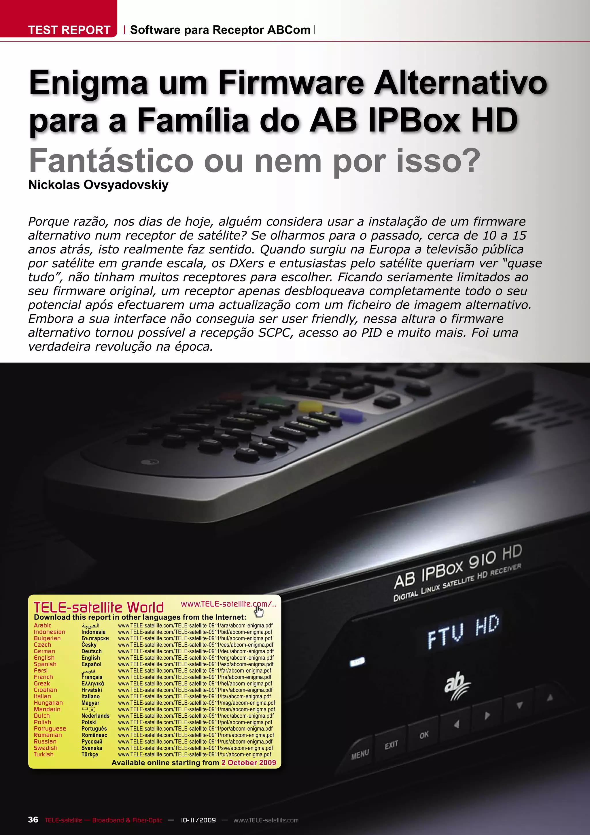 Este relatório descreve um firmware alternativo chamado Enigma1 para receptores da família AB IPBox HD. O relatório discute como instalar o firmware através de uma atualização USB e as diferenças em relação ao firmware original, incluindo novas funcionalidades e algumas limitações. O relatório também fornece detalhes sobre como usar o receptor após a instalação do Enigma1.
