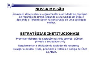 A Associação Brasileira de Captadores de Recursos (ABCR) tem como missão promover e regulamentar a captação de recursos no Brasil de acordo com seu Código de Ética, apoiando o Terceiro Setor. A ABCR busca promover debates sobre captação entre os setores público, privado e civil, regulamentar captadores de recursos e divulgar sua missão. Seus objetivos incluem oferecer cursos, conferências e concursos anuais para capacitação de captadores.