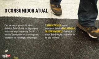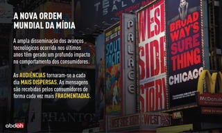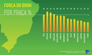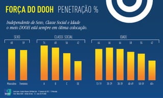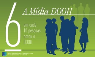 O documento analisa a audiência e a penetração de diferentes meios de comunicação, com foco em 13 mercados durante o primeiro semestre de 2012. Destaca que 20 milhões de pessoas tiveram contato com anúncios digitais em locais como edifícios comerciais e shoppings, evidenciando a relevância do DOOH (Digital Out Of Home). A pesquisa também apresenta a participação de audiência dos canais da Elemidia em comparação com outros meios, como TV e rádio.