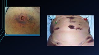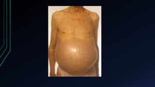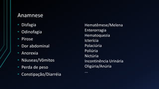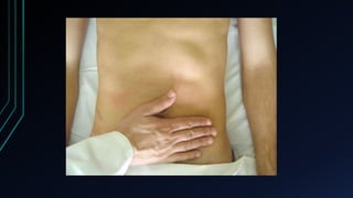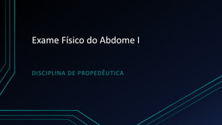 O documento descreve os passos do exame físico do abdome, incluindo inspeção, ausculta, percussão e palpação. A inspeção avalia alterações de forma, pele e movimentos. A ausculta escuta sons intestinais e sopros vasculares. A percussão identifica líquidos ou ar. A palpação profunda examina vísceras como fígado, baço e intestinos à procura de anormalidades.