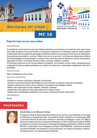 O documento discute o papel do tutor em cursos online. O minicurso abordará a influência das teorias de aprendizagem no contexto online, organização do tempo, comunicação e feedback. O objetivo é adquirir habilidades de tutoria online, analisando dinâmicas de fóruns e debatendo aprendizagem colaborativa.
