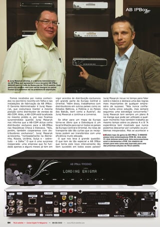 O documento descreve a AB IPBox, um novo fabricante de receptores na Eslováquia fundado em 2010. Apesar de ser uma empresa recente, a AB IPBox já estabeleceu distribuidores exclusivos em vários países europeus graças à experiência de seus proprietários. O documento também apresenta alguns dos receptores da linha da AB IPBox, incluindo o modelo topo de gama 9900HD Plus.