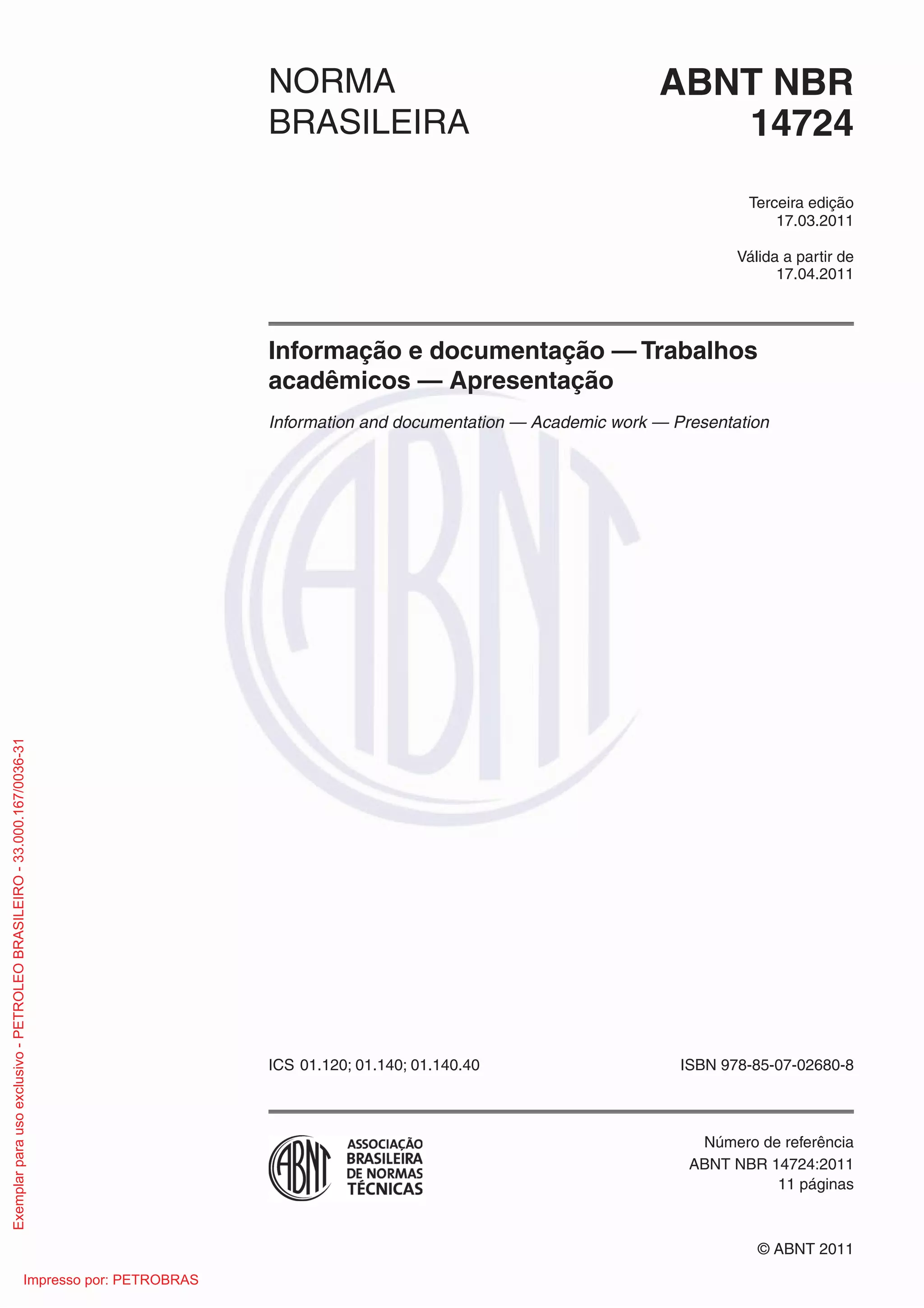 Este documento fornece diretrizes para a apresentação de trabalhos acadêmicos no Brasil. Ele define os elementos estruturais que compõem trabalhos como teses e dissertações, incluindo a parte externa (capa e lombada) e interna (elementos pré-textuais, textuais e pós-textuais). Além disso, fornece regras gerais sobre formato, paginação e citações.