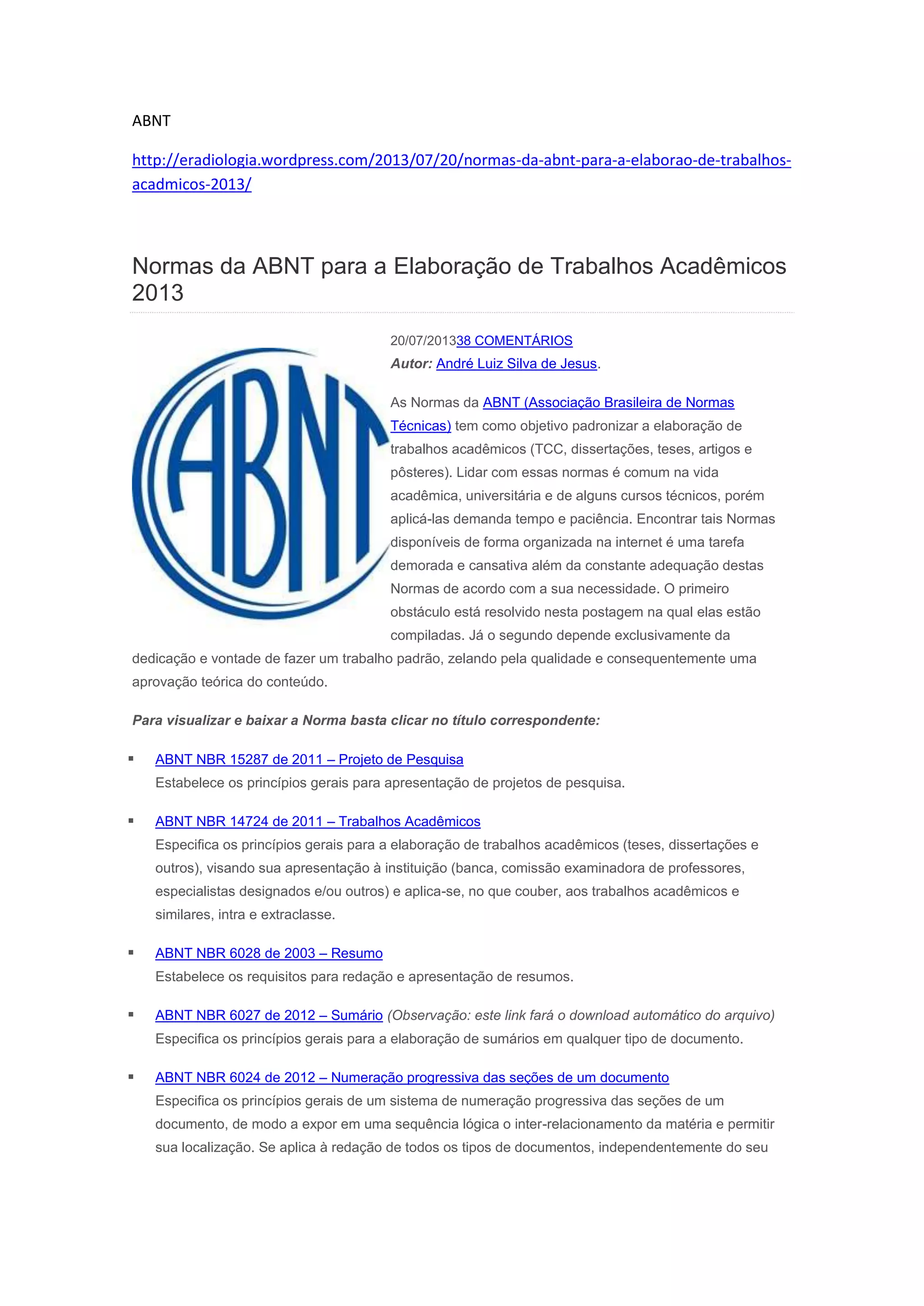 O documento descreve as normas da ABNT para elaboração de trabalhos acadêmicos, incluindo resumos, sumários, citações, referências e outros. Ele fornece links para baixar cada norma e explica brevemente o que cada uma cobre, como requisitos para projetos de pesquisa, trabalhos acadêmicos, apresentação de tabelas e mais.