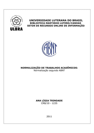 Este documento fornece informações sobre a normalização de trabalhos acadêmicos segundo as diretrizes da Associação Brasileira de Normas Técnicas (ABNT). Ele discute elementos essenciais como resumos, sumários, citações e referências. Além disso, apresenta as estruturas e formatações recomendadas para projetos, monografias, dissertações e teses.