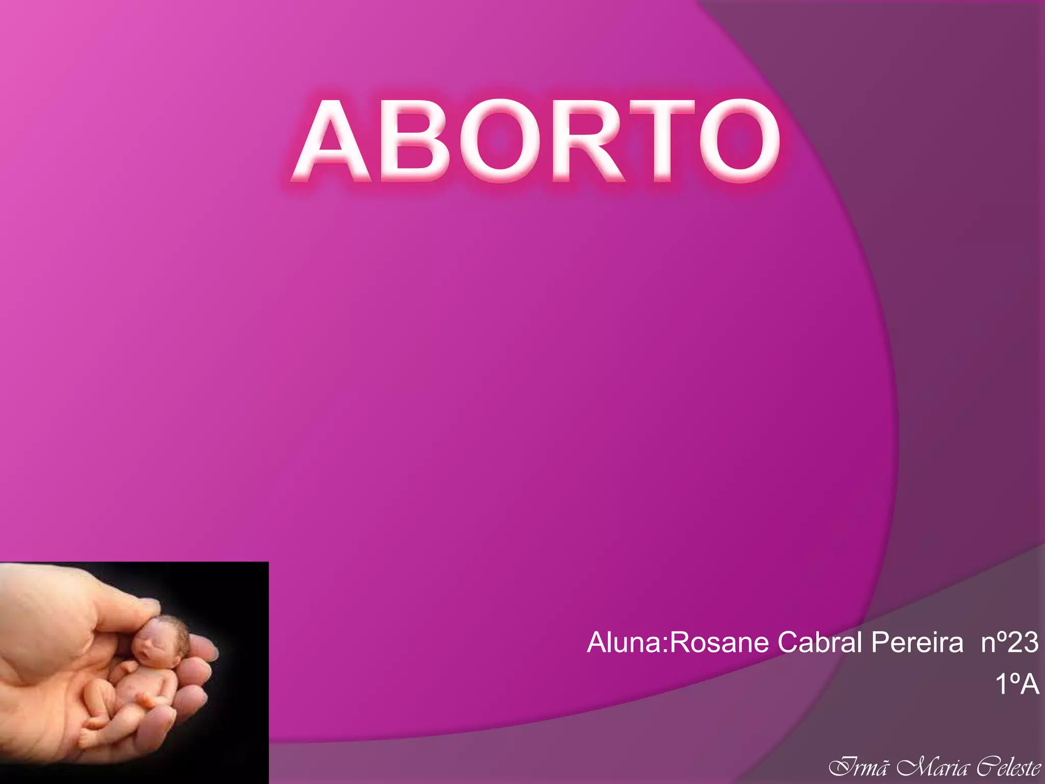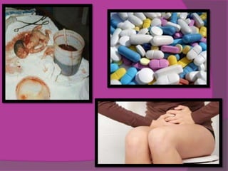 O documento discute o que é um aborto, definindo-o como a remoção ou expulsão prematura do embrião ou feto do útero, resultando na morte. Detalha alguns métodos para provocar um aborto, como pílulas, cirurgias ou esforço físico. Também diferencia entre aborto espontâneo e artificial, este último sendo causado por ação humana e tendo subcategorias como para salvar a vida da gestante ou por problemas de saúde do feto.