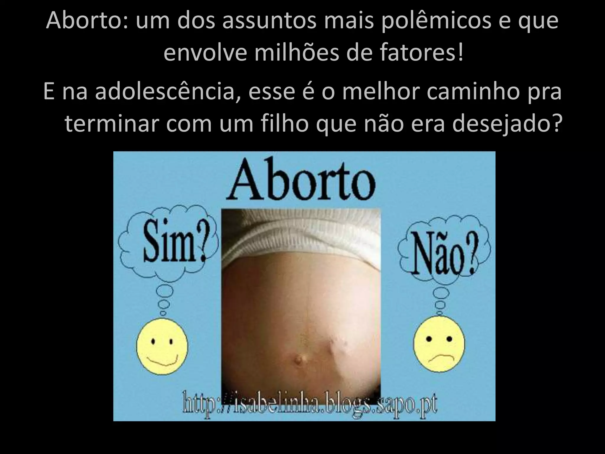 O documento discute os riscos do aborto clandestino, incluindo procedimentos perigosos, efeitos à saúde e sintomas pós-traumáticos. Apresenta os motivos que levam mulheres e adolescentes a abortos, principalmente razões sociais e econômicas. Defende que o aborto não é a única saída e que toda vida merece ser vivida.