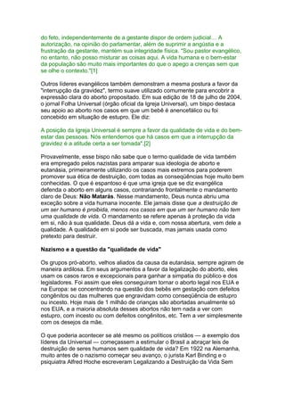 O documento discute como o apoio de alguns líderes evangélicos ao aborto em casos específicos, como anencefalia ou estupro, pode levar a consequências perigosas semelhantes às da Alemanha nazista. A legalização inicial do aborto na Alemanha levou ao assassinato de 275 mil pacientes com deficiência sob o disfarce da "eutanásia compassiva". Isso mostra os riscos de se abrir exceções à proibição do aborto.