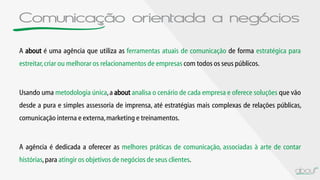 A agência about oferece diagnósticos e soluções de comunicação orientadas a negócios, analisando as necessidades das empresas e combinando ferramentas como assessoria de imprensa, relações públicas, marketing e treinamentos. A metodologia da about avalia o cenário de cada cliente para desenvolver estratégias que ajudem a alcançar objetivos de negócios por meio da comunicação.