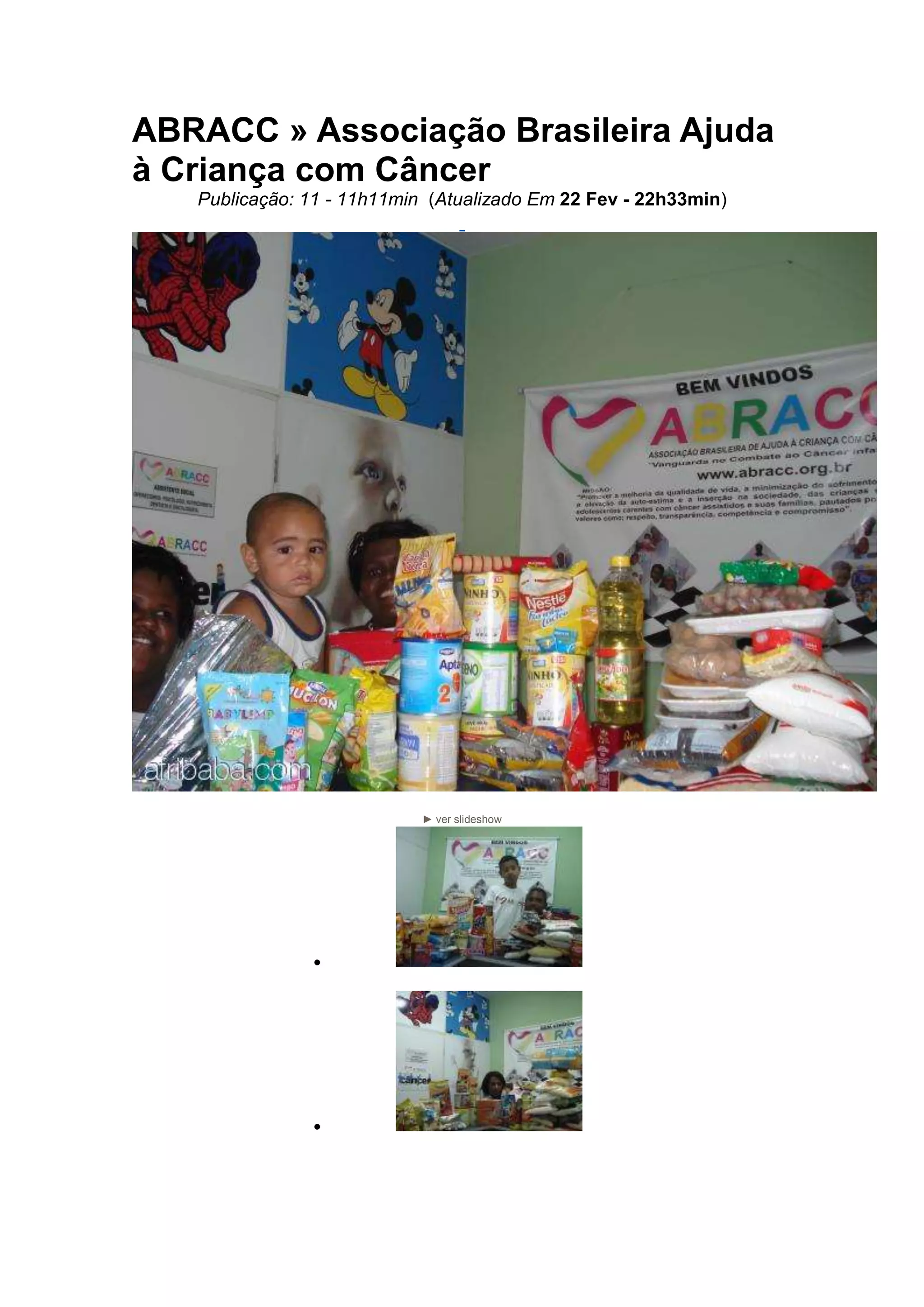 A Associação Brasileira Ajuda à Criança com Câncer (ABRACC) é uma organização que apoia crianças com câncer no Brasil. A publicação data de 11 de fevereiro de 2022 às 11h11min e foi atualizada às 22h33min do mesmo dia com um slideshow.