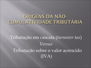 1) O documento discute a tributação em cascata versus o Imposto sobre Valor Agregado (IVA) e a não-cumulatividade constitucional no Brasil.