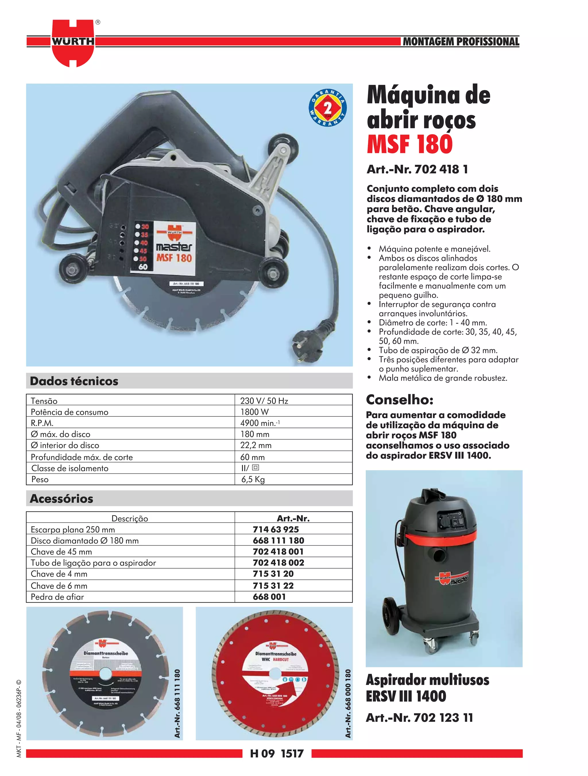 O documento descreve uma máquina de abrir roços MSF 180 e um aspirador ERSV III 1400, incluindo suas especificações técnicas e acessórios. A máquina de abrir roços possui dois discos diamantados paralelos para cortar concreto e é potente e fácil de usar. O aspirador é recomendado para uso com a máquina de abrir roços para maior comodidade.