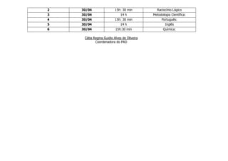 O documento descreve o Programa de Apoio ao Discente (PAD) oferecendo tutoria em Matemática Básica, Português, Metodologia Científica, Química, Raciocínio Lógico e Inglês pelas professoras Ana Paula, Tânia Mara, Cátia de Oliveira, Eliane e Priscila. Ele também lista as datas e horários dos próximos encontros de tutoria em 02/04 e 16/04 para as diferentes disciplinas.