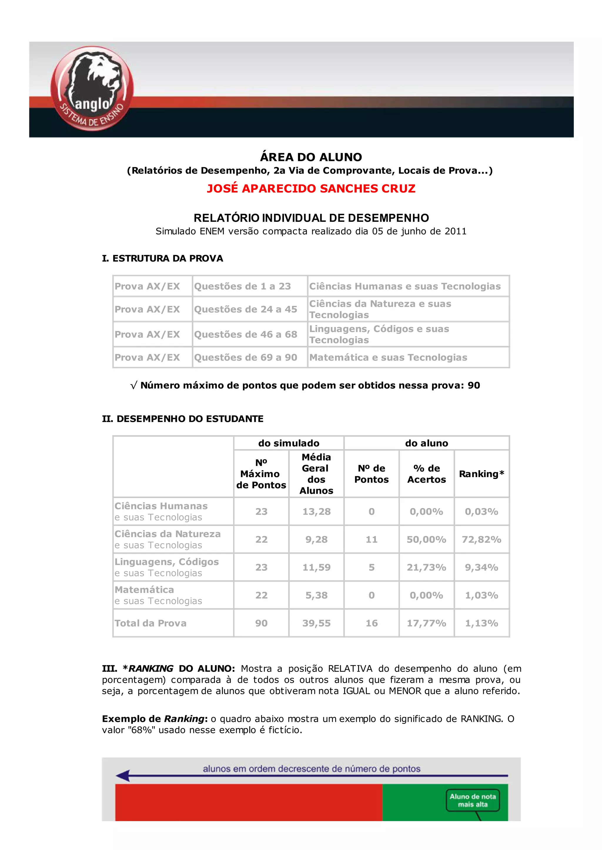 Este relatório fornece o desempenho individual de José Aparecido Sanches Cruz no simulado ENEM de 2011, mostrando que ele obteve 16 pontos de um total de 90, com destaque para 11 pontos em Ciências da Natureza. Seu desempenho geral foi melhor do que 1,13% dos outros alunos que fizeram a prova.