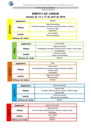 Os documentos fornecem as ementas semanais de uma creche e jardim-de-infância, listando as refeições, lanches e suplementos servidos às crianças para cada dia da semana, incluindo sopas, pratos principais e sobremesas variados, assim como leite, pão, frutas e bolachas.