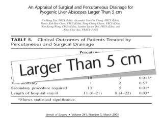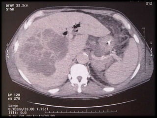 O documento discute o abscesso hepático, abordando suas características, incidência, tipos (piogênicos, amebianos e fúngicos), e fatores epidemiológicos. Destaca também métodos de diagnóstico, sinais clínicos e opções de tratamento, incluindo antibióticos e drenagem. Evidencia a importância do tratamento cirúrgico em casos mais complexos e a taxa de mortalidade associada.