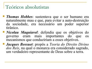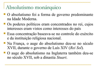 O documento descreve o absolutismo monárquico, que concentrava todo o poder político nas mãos dos reis durante a Idade Moderna na Europa. Apresenta teóricos como Hobbes, Maquiavel e Bossuet que defenderam essa forma de governo e exemplifica seu auge na França sob Luís XIV e na Inglaterra sob os Stuart, até contestações como as revoluções puritana e gloriosa.