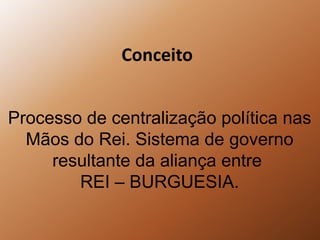 O documento descreve o absolutismo como um sistema de governo centralizado nas mãos do rei, resultado de uma aliança entre o rei e a burguesia. A burguesia tinha interesse econômico nesta aliança, enquanto o enfraquecimento da igreja e da nobreza feudal consolidaram o poder real. O rei protegia diferentes classes sociais para legitimar seu poder, instigando conflitos entre nobreza, igreja e burguesia. Estratégias como criar um exército nacional, controlar legislativo, justiça e finan