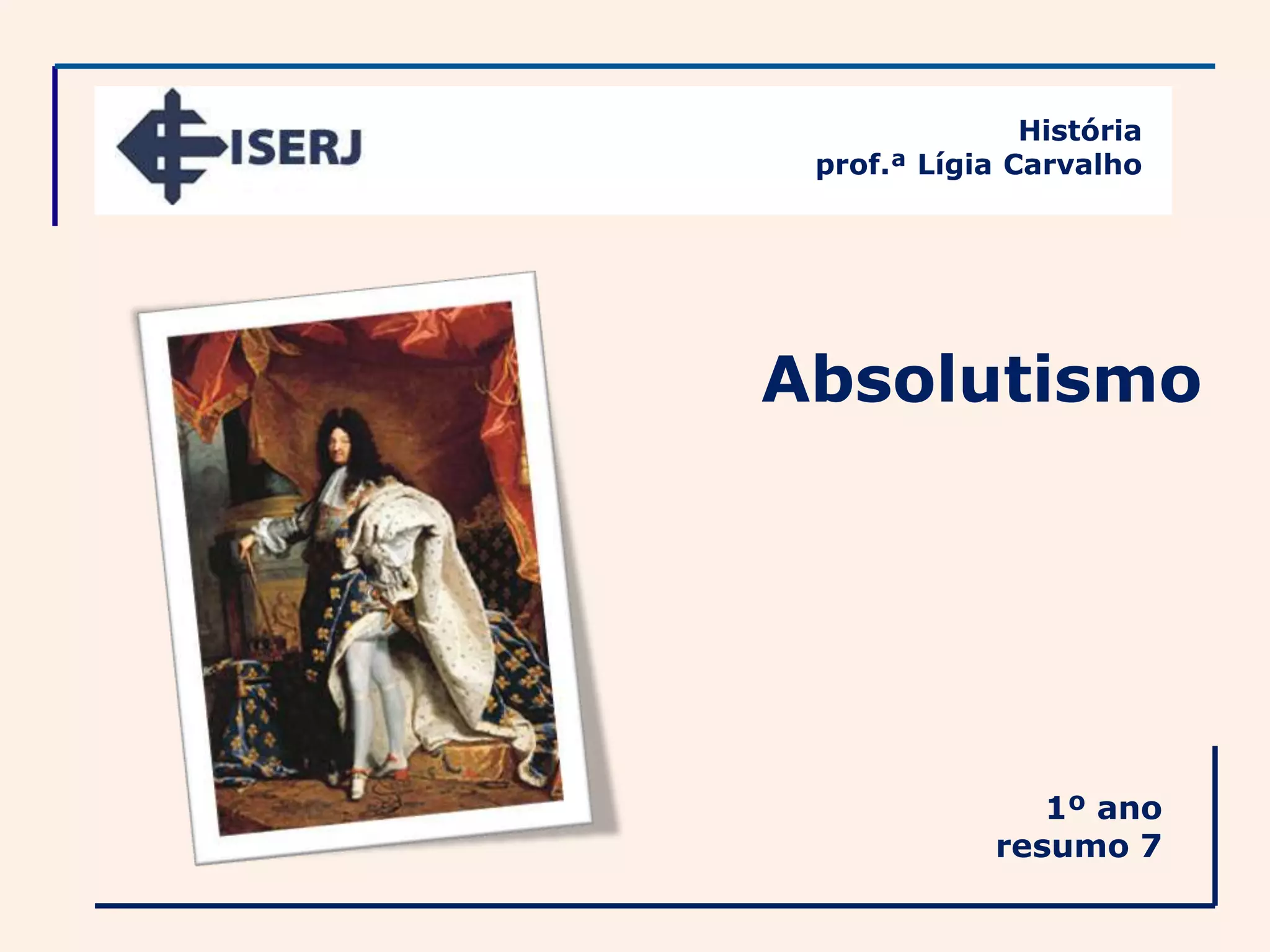 O documento descreve as características dos reis medievais versus os reis modernos no período do absolutismo. Os reis absolutos centralizaram o poder político e impuseram sua autoridade sobre os senhores feudais, fortalecendo o sistema fiscal e militarizando a nobreza. Portugal foi pioneiro na centralização política sob a monarquia absoluta.