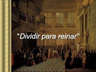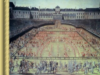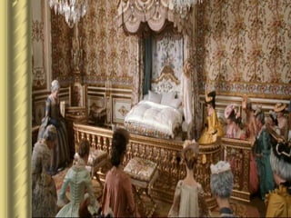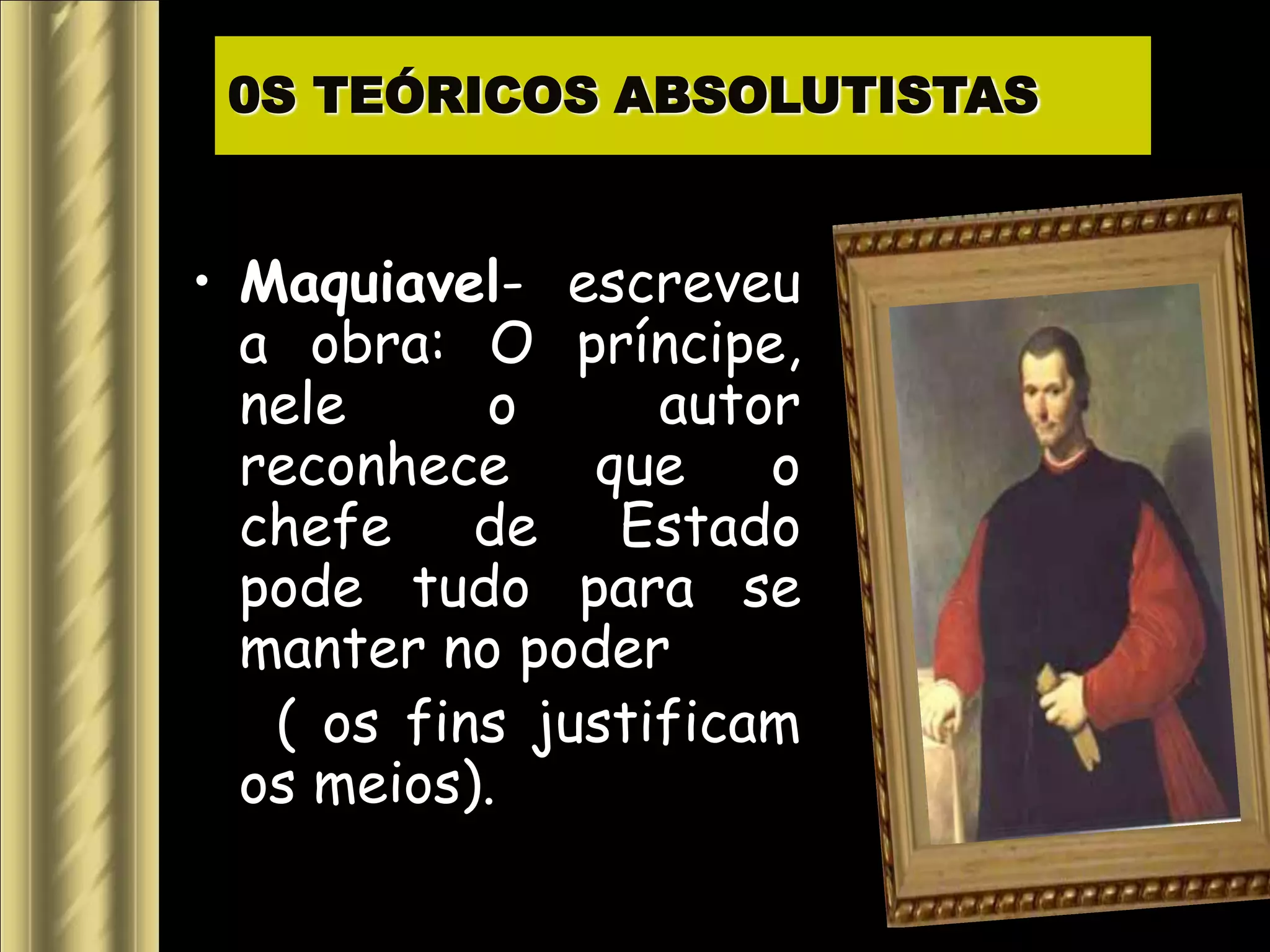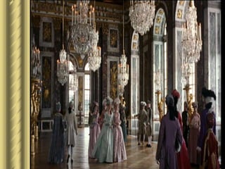 O documento descreve a teoria do absolutismo monárquico defendida por teóricos como Maquiavel, Bossuet e Bodin. Segundo eles, os reis detinham poder absoluto dado por Deus e não precisavam prestar contas. Luís XIV da França é apresentado como exemplo, governando sem limites e controlando todos os aspectos da sociedade francesa por meio de sua magnífica corte em Versalhes.