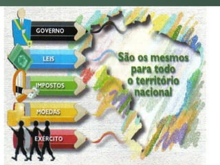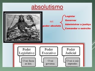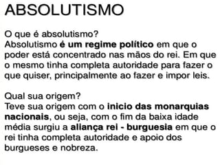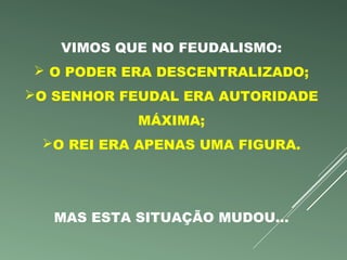 O documento discute a transição do feudalismo para o absolutismo monárquico. (1) O poder era descentralizado no feudalismo, com os senhores feudais como autoridade máxima e os reis como figuras sem poder. (2) Com o surgimento das cidades e do comércio, surgiu a burguesia, levando ao fim do feudalismo. (3) Os reis foram ganhando poder de volta e conquistaram a autoridade máxima, dando origem aos estados nacionais.