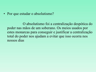 O documento discute o absolutismo como uma forma de governo centralizada que concentrava todo o poder nas mãos de um monarca. Apresenta os contextos históricos e teóricos do absolutismo na França, Inglaterra, Portugal e Espanha entre os séculos XV e XVIII, incluindo teóricos como Jean Bodin, Jacques Bossuet e Hugo Grotius, e monarcas como Luís XIV e a dinastia Tudor na Inglaterra.