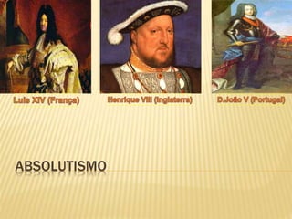 O documento descreve o absolutismo como um sistema político que vigorou na Europa entre os séculos XVI e XVIII, no qual os monarcas concentravam grande poder. Apresenta as teorias de pensadores como Jean Bodin, Jacques Bossuet, Nicolau Maquiavel e Thomas Hobbes em defesa do absolutismo real. Detalha também os reinados absolutistas de Luís XIV da França, Henrique VIII da Inglaterra e D. João V de Portugal.