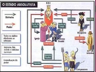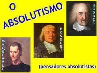 O documento discute o absolutismo, começando com os fatores que levaram à formação dos estados modernos na Europa, como o enfraquecimento do feudalismo e o crescimento das cidades. Em seguida, descreve como os estados modernos centralizaram o poder político e religioso através de burocracias, exércitos e leis unificadas. Por fim, apresenta pensadores como Maquiavel, Bodin e Hobbes, cujas ideias apoiaram a consolidação do absolutismo nos séculos XVI-XVIII em estados como Portugal, Espanha