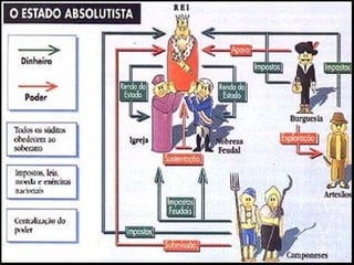 O documento descreve o absolutismo como um sistema de governo predominante na Europa moderna, caracterizado pela concentração de poderes nas mãos dos monarcas. Apresenta teóricos como Maquiavel e Hobbes, que defenderam o poder absoluto dos reis como necessário para a ordem e estabilidade dos Estados. Também aborda elementos do mercantilismo como intervencionismo estatal na economia e o protecionismo comercial entre metrópoles e colônias.