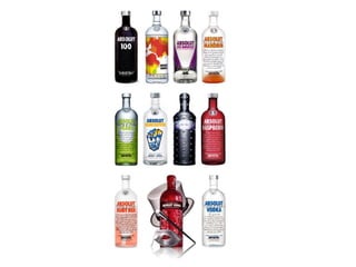 A Absolut foi criada em 1879 na Suécia e se tornou líder mundial de vodkas. Sua vodka é produzida através de um método de destilação contínua mais de 100 vezes e é feita com trigo de inverno e água pura da Suécia. A marca se popularizou através de campanhas publicitárias inovadoras focadas na garrafa desde 1980 e hoje está presente em mais de 130 países.