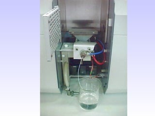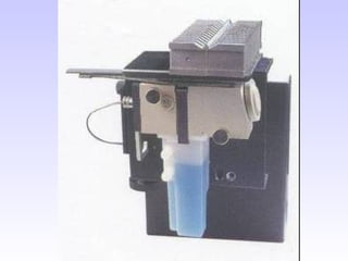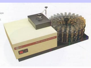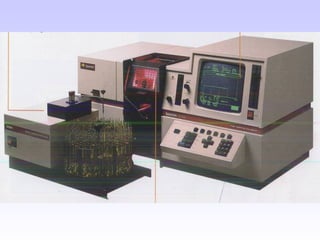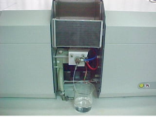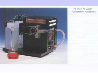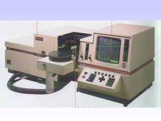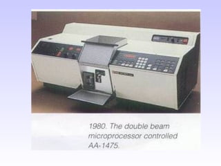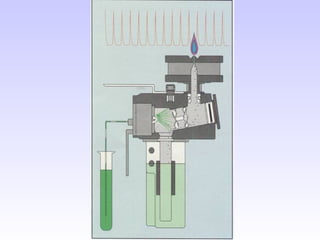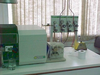 O documento discute as fontes de radiação utilizadas em espectrofotometria de absorção atômica, incluindo considerações sobre a radiação ideal, fontes contínuas e de raias espectrais, e lâmpadas de cátodo oco. Também aborda sistemas de nebulização, queimadores, interferências e métodos alternativos de atomização sem chama, como atomizadores eletrotérmicos e geração de hidretos.