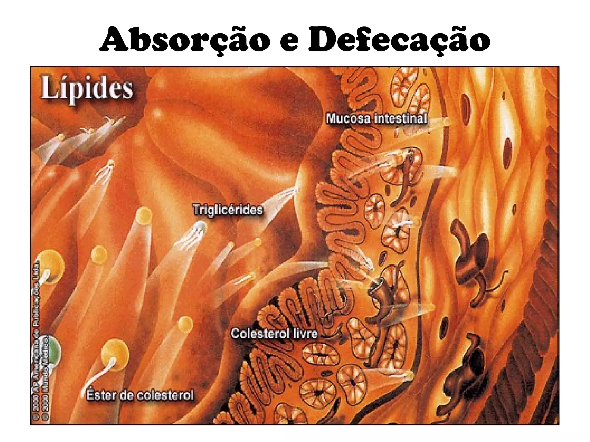 O documento descreve a absorção e defecação de nutrientes no trato gastrointestinal humano. A absorção no estômago é pouco significativa, enquanto a absorção no intestino delgado, especialmente no jejuno e íleo, é grande devido à sua grande superfície e vasos sanguíneos. Nutrientes absorvidos são transportados para as células pelo sangue e linfa, e substâncias não absorvidas passam para o intestino grosso e são eliminadas nas fezes.