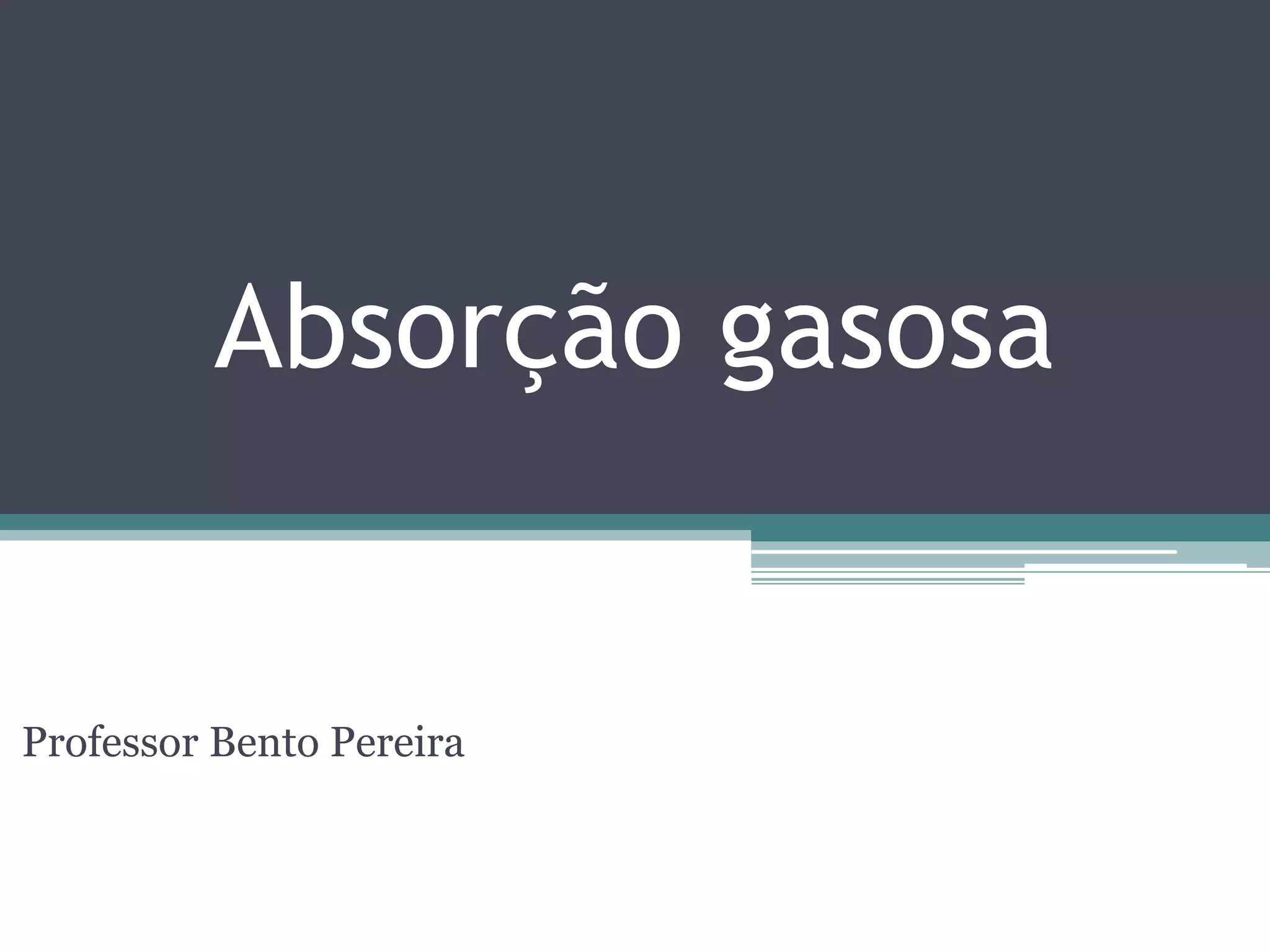 O documento descreve o processo de absorção gasosa, no qual um componente solúvel é transferido da fase gasosa para uma fase líquida absorvente. Apresenta as aplicações do processo com e sem reação química e descreve o funcionamento de uma coluna de absorção em contracorrente, incluindo balanços de massa.