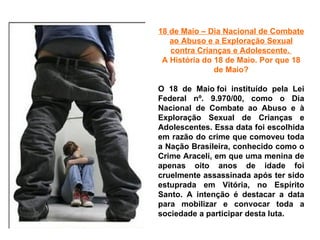 O documento discute o Dia Nacional de Combate ao Abuso e Exploração Sexual de Crianças e Adolescentes no Brasil, celebrado em 18 de maio em memória de um crime que chocou o país. Ele explica o que é violência sexual, caracteriza abuso e exploração, e enfatiza a importância da denúncia para proteger as vítimas e prevenir esses crimes.
