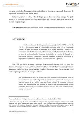 O documento discute o abuso sexual infantil, seus efeitos na criança e a importância de denunciar esses casos. A família é apontada como o local mais comum para o abuso ocorrer. O documento também destaca sinais de comportamento que podem indicar abuso sexual e os danos psicológicos causados às crianças.